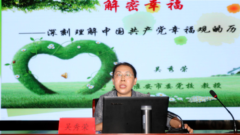 淮安市委党校副教育长、教授吴秀荣应邀到场为广大党员职工作《解密幸福--深刻理解中国共产党幸福观的历史演进》专题宣讲。“我们党的百年历史,就是一部践行党的初心使命的历史,就是一部党与人民心连心、同呼吸、共命运的历史。”宣讲以习近平总书记讲话为开篇,依次从幸福的本质、中国共产党幸福观历史演进、中国共产党的成功原因剖析三个方面逐层推进,着重从物质生活和精神生活相统一、享受相统一、个人幸福和集体幸福的统一分析了中国共产党幸福观历史演进,剖析了中国共产党成功的原因,宣讲还从四个方面详细阐述了习近平的幸福观:传承和发展了马克思主义幸福观、创新和超越了中国传统幸福观、激荡了个人层面的奋斗精神、彰显了领导层面的担当气派。宣讲最后以“幸福,不仅仅是名词;幸福,更是动词﹍﹍”为结尾,给人启迪,发人深思。