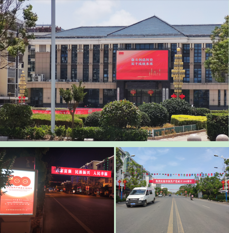 利用《淮海大地》报刊登淮海党史学习教育重大活动和特色情况,并在报纸上开辟“党史学习教育在淮海”“‘学史力行 争当先锋’征文”专栏,让农场开展的党史学习教育任务通过传统媒体的分发,让大家知晓农场公司党史学习教育情况;利用橱窗开设专栏,目前已连续两期刊登了农场党史学习教育专栏,通过图文并茂的形式,将农场新近开展党史学习教育的做法直观地展现出来,让大家知其然,更知其所以然,从而在农场深化党史学习教育的成果;通过现代媒介的微信公众号进行党史学习教育的传播,到目前为止,已经发布有关党史学习教育的各类会议、做法、经验及参与互动等44篇文章,将党史学习借助现代互联网进行传播,提升淮海党史学习教育在农场内外的效果和影响力;在农场公司广大党员和青年员工中开展党史知识题目有奖专项征集活动,并从6月1日起连续开展26个星期为平台的党史知识有奖竞赛活动周,有效地提升农场公司党员干部和管理人员的积极性,促进了大家实施以考促学,以学促干活动的热潮;农场文化广场是淮海人每晚休闲娱乐的场所,农场通过在广场前的LED大屏上播放党史学习教育相关的红色电影、微纪录片、标语、习总书记七一讲话及新闻联播等内容;在文化广场东侧楼体上书写“人民有信仰 国家有力量 民族有希望”广告牌,利用淮海路跨路广告宣传牌,书写“热烈庆祝中国共产党成立100周年!”“国家富强 民族兴旺 人民幸福”白字红底灯光标语,利用淮海路两侧灯光广告宣传牌的效应,弘扬军垦传统文化,从而达到弘扬主旋律,振奋人心的作用;利用农场企业微信平台,组建网上农场党委理论中心组(扩大)群,通过每月配发“第一议题”材料,将习近平总书记的重要讲话内容原文全文转载;网上党史学习教育课堂的开展及红色纪录片的推送,将每项江苏省农垦集团公司党史学习教育工作简报上传平台,让大家实时了解垦区党史学习教育活动的开展情况和发展动态,从中汲取党史学习教育中的闪光点,根据自身单位的实际来触类旁通、为我所用,从而提升党史学习教育的成果;利用农建四师陈列馆国家AA级红色旅游基地的优势,除安排基层党组织和党员干部入馆接受党史学习和军垦传统文化教育外,自党史学习教育开展以来,已为垦区内外3000多人次党员干部和职工群众提供讲解服务。图为淮海部分党史学习教育宣传标语。