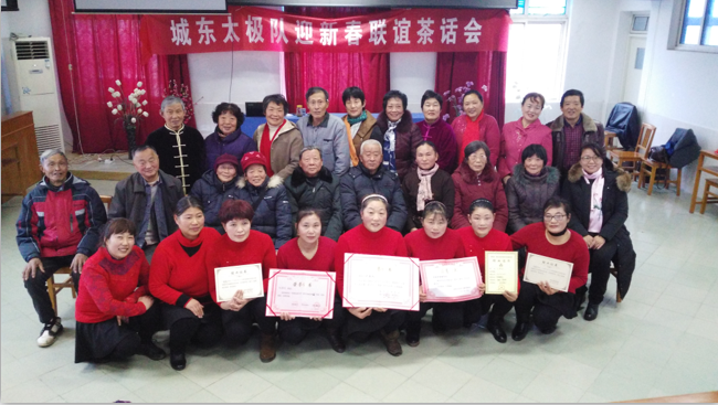 联谊会上,太极队队长胡建军发言说:“城东太极队在过去的一年里,多次参加射阳县举办的各项中老年人的活动,并屡次获奖。希望大家在新的一年里,继续发扬团结友爱的精神,齐健身、同欢乐。”