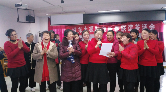 窗外寒风瑟瑟,室内欢声笑语春意浓浓。两个小时的演出在《难忘今宵》的合唱中结束。联谊会的成功举办,展现出当代中老人追求积极向上、乐观生活,更是当今幸福生活、和谐社会的一个缩影。图为淮海城东太极队联谊茶话会活动的场面。