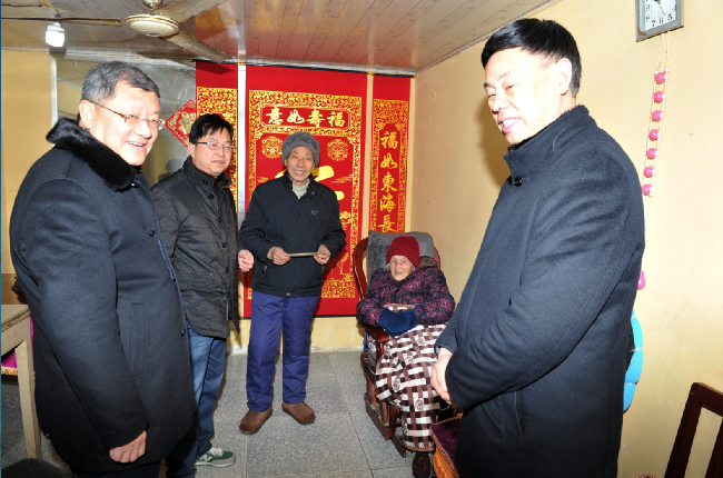 “我们党政工领导来给您拜年了!”王进强一进门就对坐在沙发上的百岁老人说。