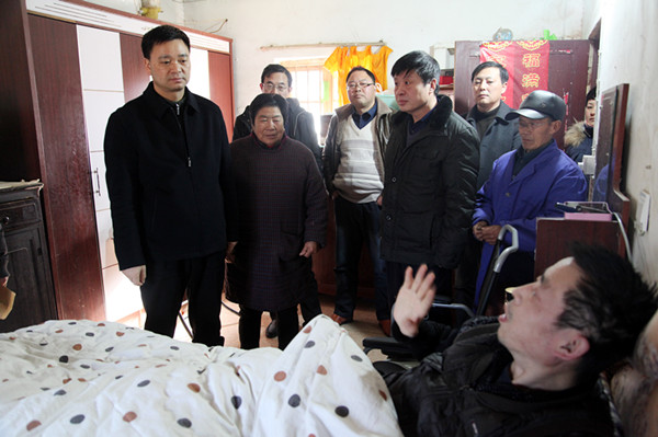 在居民新区退休职工贾则元家,姜建友来到贾则元的床前,将集团公司党委的温暖送到了他的心坎里,贾则元因病卧床不能说话,当看到集团公司和农场领导来到家中看望他时,激动的热泪盈眶,在旁的家人再三感谢集团公司领导对他们的关心。姜建友在了解了贾则元的病情后,叮嘱他的家人一定要照顾好老人的生活起居,当得知老人得病一年多卧床不起都是子女在照顾时,姜建友欣慰的说,有这样的子女也是老人的福气,希望他们继续照顾好老人,让老人老有所依,病有所托。在困难职工李兵家,姜建友来到床前,握着李兵的手询问了他目前的病情和治疗情况,当得知他是糖尿病综合并发症时,叮嘱他要积极做好治疗,特别是要去大医院做检查,控制好血糖,要树立战胜疾病的信心。所到之处,感谢声不绝于耳,在这寒冷的冬日,困难职工的家中被一股股暖流包围。(钱厚红)