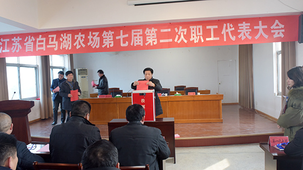 在大会预备会议通报参会人数、通过大会议程后,大会在庄严的国歌声中宣告开幕,党委书记、场长姚春华作了《关于江苏省国营白马湖农场公司制改革方案的说明》,明确了改革的目的和在国有资产处置、法人治理结构、组织领导、进度安排等方面的具体要求和措施,有效地提高了代表们对农场公司制改革的认识和认同。接着,大会又以举手表决的形式,通过了职工董事、职工监事选举办法,还按照规定程序和选举办法,分别通过票决、投票选举和职工代表分别签字等形式,顺利通过了《关于江苏省国营白马湖农场公司制改革方案的决议》,选举产生了一名职工董事和一名职工监事。党委副书记韩正光宣读了大会决议,宣告农场公司制改革方案顺利获得通过。