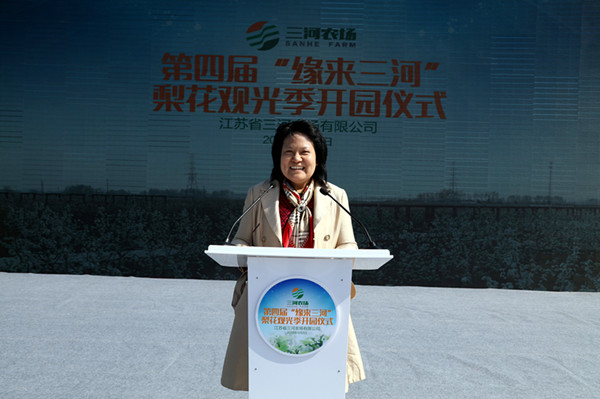 江苏农垦集团公司党委委员、总会计师刘克英代表农垦集团在开园仪式上讲话,她说,三河,用一幅幅美丽的画卷,展示了江苏农垦的大地文化、绿色文化,展示了江苏农垦的和谐与包容、开放与创新,展示了三河农场敢为人先、争创一流的志气!希望三河进一步发扬农垦精神,把握机遇,艰苦奋斗,勇于奉献,开拓创新,将美丽三河真正打造成生态家园、旅游乐园,为地方经济发展和职工居民增收作出新的贡献。期待更多的朋友走进三河、了解三河、关注三河,享自然生态之美、品历史文化之韵。