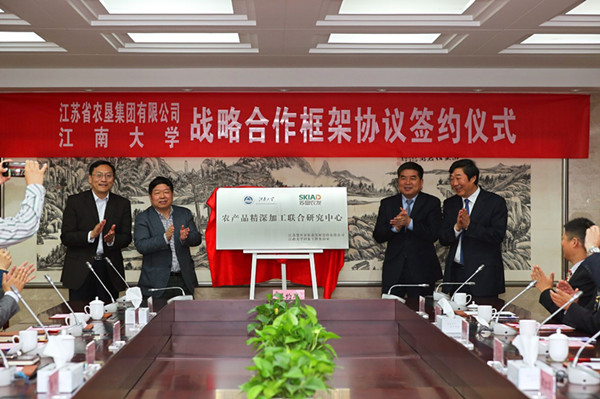 胡兆辉与吴正国在江苏农垦与江南大学全面战略合作框架协议书上签字。苏志富与陈正行教授在苏垦农发与江南大学国家工程实验室共建农产品精深加工联合研究中心合作协议书上签字。魏红军、胡兆辉,陈坚、吴正国共同为“苏垦农发股份公司-江南大学国家工程实验室农产品精深加工联合研究中心”揭牌。