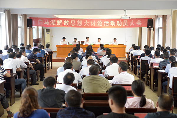 党委书记姚春华发表题为《解放思想 提高站位 为推动农场改革发展凝聚力量》的动员讲话,指出,白马湖在解放思想、促进发展方面有着优良的传统。改革开放以来,每一次改革无不与思想解放息息相关,每一项改革的推进,都是解放思想的生动实践和最好证明,每一次改革都为发展注入了崭新活力、增添了强劲动力。面对新时代新目标,面对处于改革发展洼地的现实,必须“重整行装再出发”,迅速掀起新一轮思想大解放的热潮,切实把重槌敲在响鼓上,为推动经济社会高质量发展和改革任务顺利完成注入持久动力。对此,他强调了三个方面的意见。第一、立足时代坐标,牢记职责使命,深刻认识推进思想大解放的重要意义。重点要明确推进新一轮思想大解放,是深入贯彻习近平新时代中国特色社会主义思想,加快全面建成小康社会,推动高质量发展,全面深化改革、增创发展新动能,推进作风持续转变的迫切需要。第二、突出主题主线,强化问题导向,以思想大解放推动经济社会再发展。提出活动要以“学习新思想,改革再出发,开放迈新步,发展高质量,农场见行动,人人争贡献”为主题,从以下六个方面深入解放思想、着力寻求突破:一是围绕经济质效如何提升解放思想,在培植主导产业、特色产业上求突破。二是围绕体制机制如何完善解放思想,在深化改革上求突破。三是围绕创业创新如何推进解放思想,在抢抓机遇上求突破。四是围绕民生问题如何改善解放思想,在提升职工居民幸福感获得感上求突破。五要围绕环境治理如何优化解放思想,在生态宜居幸福农场建设上求突破。六要围绕推进全面从严治党解放思想,在提升基层党组织的号召力战斗力上求突破。第三、加强组织领导,深入扎实推进,确保思想大解放取得实实在在的效果。做到系统谋划、统筹推进,精心组织、争创特色,注重实效、推动工作。