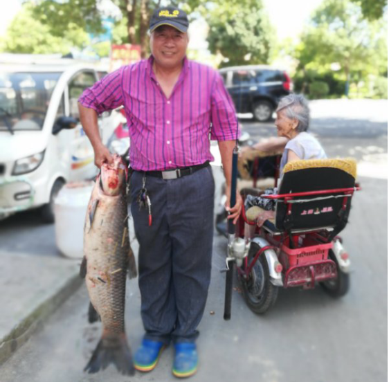 听说袁幕辉钓了一条30多斤重的大鱼,附近一位饭店老板找过来,向袁幕辉出1000元,欲将大青鱼买下来,被袁幕辉婉言谢绝:“你出再高的价钱我也不会卖的。因为这条鱼是从公共河道中钓上来的,我还得将它分给大家吃。”说完,袁幕辉从家里拿来菜刀,将鱼鳞�了,将鱼肚剖开来,掏出内脏,扣干净鱼腮,将鱼洗干净后,剁成十几块,然后分送给农场的鳏寡孤独老人与左邻右舍品尝。图1:鱼拎起来,鱼头超过袁幕辉的腰眼。图2:哟,好大的鱼啊,我还没它高呢!图3:5个鱼鳞排在一起近21厘米。