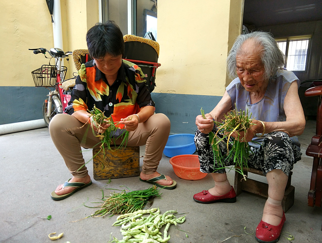 家人买菜回来,老人就会主动地搬起小板凳,坐下来择菜、掐豆荚、去老叶或剥豆米。有时老人还跑到户外邻居家的蔬菜地上去拔草,弄得邻居直喊,老奶,赶紧不要拔,要是你再有个三长两短,叫我怎么说得清。