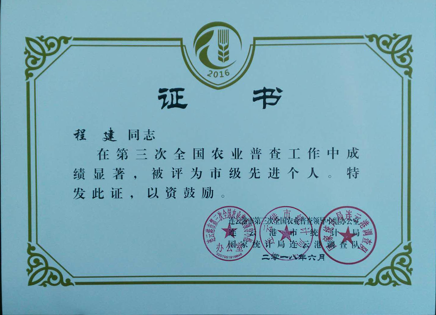 近日,从连云港市统计局传来喜讯,东辛农场合兴社区居委会干事程建同志被市统计局授予“第三次全国农业普查先进个人”荣誉称号。
