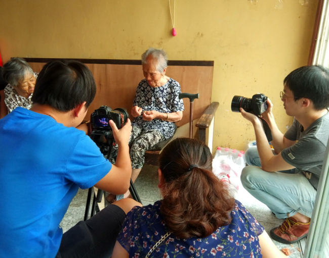 当天一整天,澎湃新闻采访组一行围绕老人的生活起居活动,以纪实的手法全程展开。凌晨5点多种,澎湃新闻记者就来到了张瑞瑞的家中,按照老人的作息规律,实时拍摄老人起床、喝早茶、散步、游玩和回家吃早饭、择菜以及与家人聊天的情况,并找来与老人相熟的邻居了解百岁老人先前的一些情况。当记者从新闻媒体上获悉老人还会穿针引线做针线活时,老人的家人特地拿来针线和一道破损的衣襟,让老人展示。没曾想,老人一拿到针线,还笑说嗔怪地说,你们这些年轻人不弄,叫我一个老人做,惹得大家哈哈大笑。随后,老人认真地穿起了针线来,虽然第一根线头有点毛,但老人卷线头的动作和一手一脚地专注,还是让在一旁的记者赞叹,他们不时地用近景拍摄着老人穿针引线的过程。也就一会儿,老人成功地穿过了一根线,随即用更快的动作穿完了第二根针。这一连贯的动作,把记者的眼睛都看花了。“叫我穿,我肯定穿不过去。”澎湃新闻记者朱伟辉说。