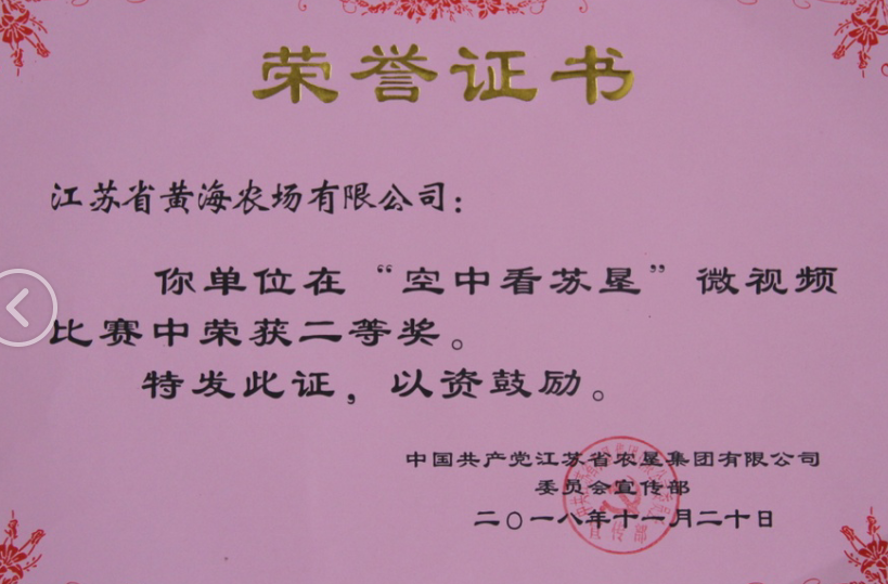 在日前结束的江苏农垦新闻宣传工作会议上,黄海农场有限公司拍摄制作的微视频《空中看苏垦—苏北明珠》及《苏北明珠、美丽黄海》品牌形象宣传片分别荣获二等奖;黄海农场有限公司网站被集团公司《评为2018年度优秀网站》。