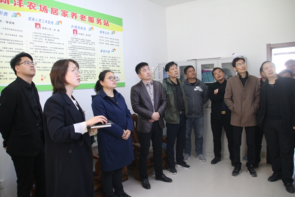 途中,戴学林简要介绍了新洋经济社会基本概况,重点就产业发展、社会职能改革、资产资源盘活利用、社区创新管理、企业文化建设等进行介绍。他说,近年来,新洋不断深化改革,以改革促发展,加强农业高效精细化管理,挖掘林苗木生产潜力,盘活存量资产,使“死资产”变成“活资源”,经济发展呈现良好势头。根据社会职能改革要求,围绕“内部分开、管办分离、授权委托、购买服务”十六字方针,积极稳妥推进社会职能改革,进展顺利。新洋连续26年蝉联省级文明单位称号,紧紧抓住江苏农垦新时代文明实践中心建设试点的机遇,结合传统文化建设成果,以爱心超市为载体,志愿者服务为特色,将新时代文明实践、文明单位创建与精准帮扶、家政服务、居民素质提升相结合,大力开展大爱新洋创建活动,弘扬真善美,提高居民幸福指数,不断丰富大爱文化内涵。同时,以居家养老服务中心为依托,引进智能化管理系统,积极探索和满足老年服务的深层需求,不断丰富老年服务内容,积极应对场域老龄化现状,践行尊老爱老敬老的良好风尚。