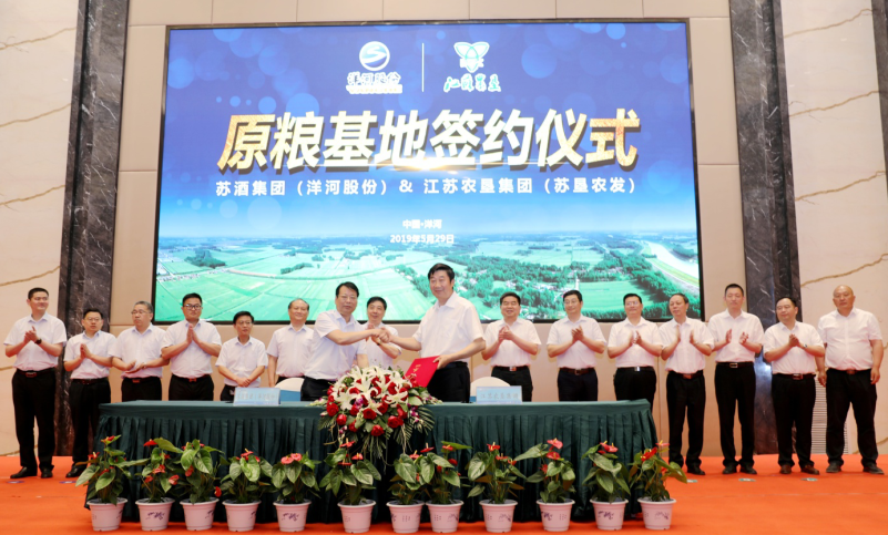 5月29日,江苏农垦(苏垦农发)与苏酒集团(洋河股份)原粮基地签约仪式在洋河酒厂隆重举行。集团公司党委书记、董事长魏红军,总经理胡兆辉,苏酒集团(洋河股份)党委书记、董事长王耀,苏酒集团(洋河股份)总裁钟雨出席活动。中国工程院院士、扬州大学教授张洪程等专家见证此次签约仪式。