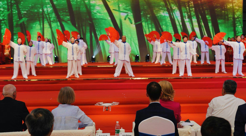 开幕式过后,与会领导和嘉宾共同观看了“苏北明珠·美丽黄海”文化活动展演。龙鼓、太极、功夫扇、旗袍秀组合表演《激情6月》、少儿足球操表演《我健康 我快乐》、古筝、古琴、茶艺、古典舞蹈表演《盛世琴韵》,示范园内欢歌笑语、载歌载舞,见证了第五届田间日的成功举办,用文化盛宴精彩展现了“苏北明珠·美丽黄海”。