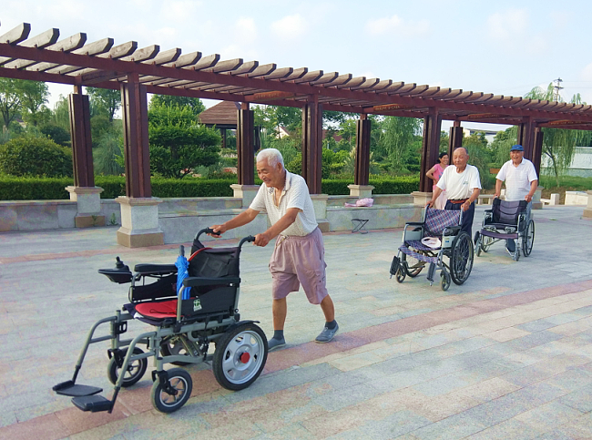 我们每天坐在轮椅上来公园看看风景、聊聊天,生活也是很充实。当然了,推着轮椅车在公园里转圈赛跑,也是我们自我加强体能锻炼的一种活法,这样的生活我们这些老头都感到很惬意。”3位老人一致说。