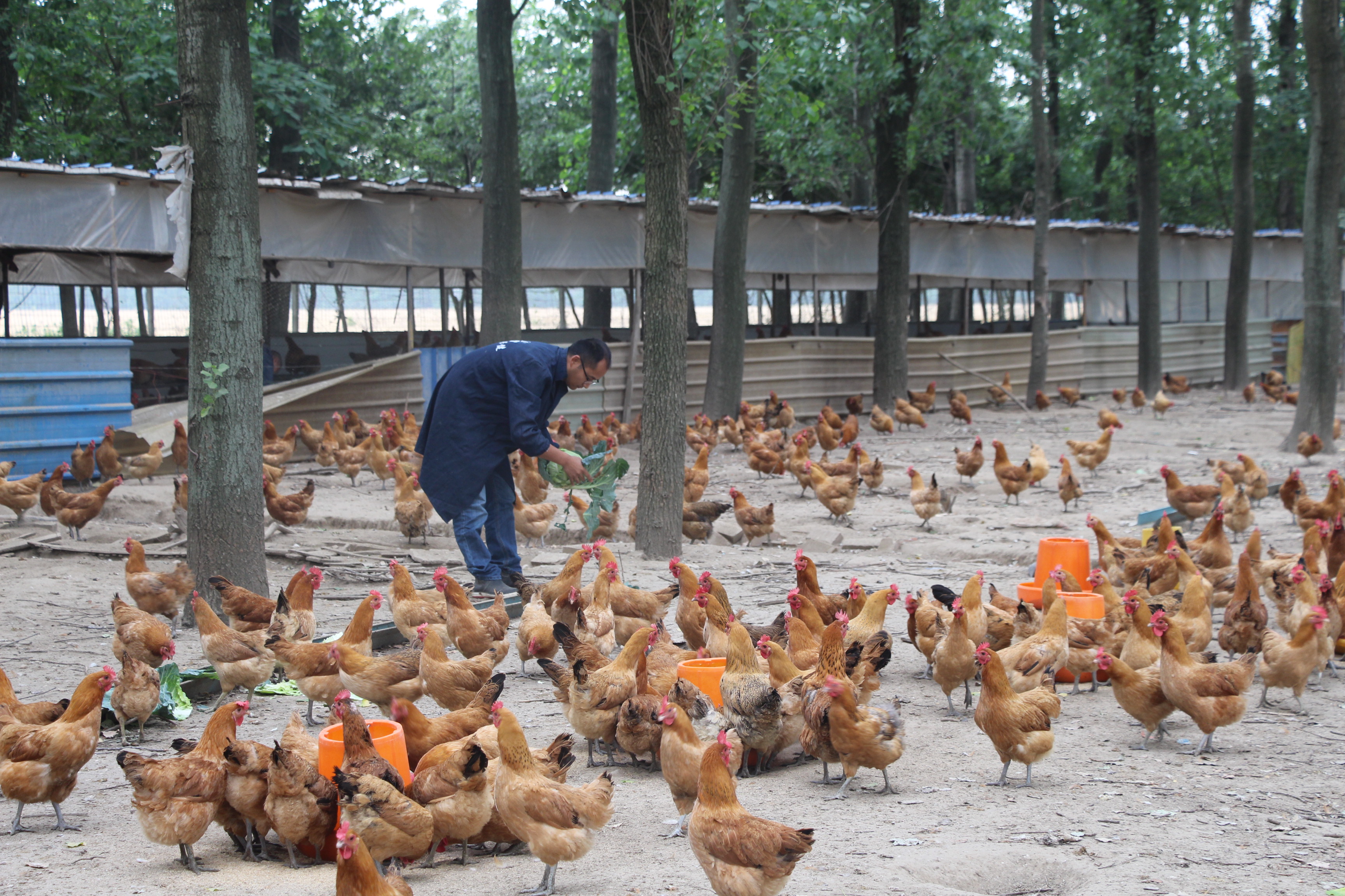 海安农场场部的南边是农场三大队,走进三大队,一片树林便映入眼帘,不远处听到连绵不断的鸡鸣声,走近一看,原来是一个林下养鸡场,鸡场的主人是一位年仅36岁的年青人,他名叫田佳斌,来自如皋市江安镇。