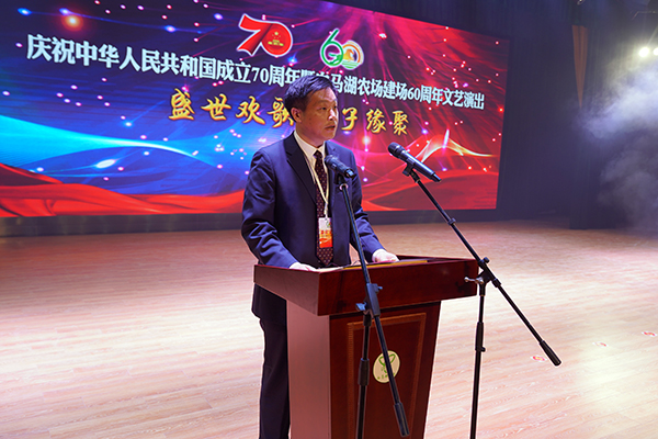 党委书记姚春华在演出开始前发表了热情洋溢的讲话,代表农场公司党委向广大党员干部和职工群众致以节日的祝贺和亲切的问候!向所有关心支持白马湖经济社会发展的各界人士、各位佳宾表示由衷的敬意和美好的祝愿!向在农场公司举办的“甲子情深、爱心无限”慈善捐赠活动中慷慨解囊人士的善心义举表示衷心感谢!他指出,甲子逢盛世、盛世谱华章,能够亲身参与并见证60年甲子盛会,是幸运、也是荣耀,更是一份沉甸甸的任务和责任。希望大家以建场60周年为契机和起点,深入贯彻落实习近平新时代中国特色社会主义思想,围绕建设美丽、生态、幸福、和谐新农场的目标任务,积极践行新思想、树牢新理念、落实新举措,坚定信心、保持定力、跃马扬鞭、奋力作为,与伟大祖国同呼吸、共奋进,不断开启加快发展新征程、不断谱写新时代更加灿烂新篇章!