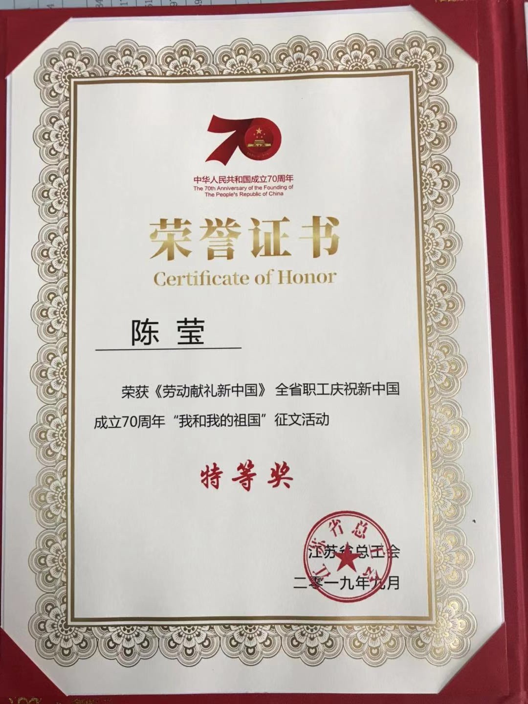 经农垦物业公司工会和集团工会推荐,物业公司职工陈莹同志以《假如我有一台时光机》一文参加《劳动献礼新中国》全省职工庆祝新中国成立70周年“我和我的祖国”征文活动并荣获特等奖。该活动共收到文稿5204封,特等奖10人,陈莹代表江苏农垦获得荣誉。
