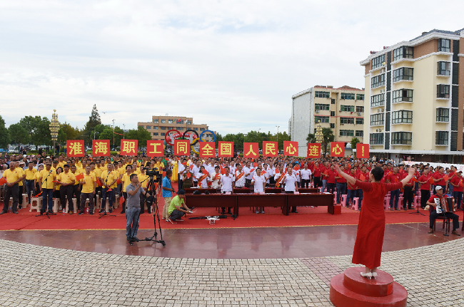 本届广场文化节在舞蹈《幸福舞起来》中拉开了帷幕。《祝福祖国》《唱支山歌给党听》《为祖国干杯》等一支支舞蹈,演员们以欢快的舞姿,从心底间来祝福农场职工居民蒸蒸日上的新生活;诗朗诵《青春中国》,把共产党人经历曲折道路上的艰辛,为了目标和希望那不屈不饶的精神,真情地展示在人们的面前;情景剧《十二人抬桥》展示了农四师老军工们面对艰难困苦的条件,保持了艰苦创业和团结奋进的英雄气概,为我们树立了传承的榜样;歌伴舞《人民的好干部——焦裕䘵》,把焦裕䘵以身体力行的姿态和清正廉洁的作风,演绎得淋漓尽致,反映出共产党人时刻把人民的利益放在首位,践行着为了人民的铮铮誓言。爱国歌曲《没有共产党就没有新中国》《爱我中华》《我们走在大路上》《我和我的祖国》在四个不同颜色服装的方阵中一波接着一波地传唱,挥舞着五星红旗的方阵,场面气势恢宏。最后由335人组成的五个方阵同声演唱《歌唱祖国》,把文化节活动推向了高潮,特别是演唱席中竖起的“热烈庆祝新中国成立70周年!”和“淮海职工同全国人民心连心!”红底黄字的标语,让大家心潮澎湃,激情满怀。