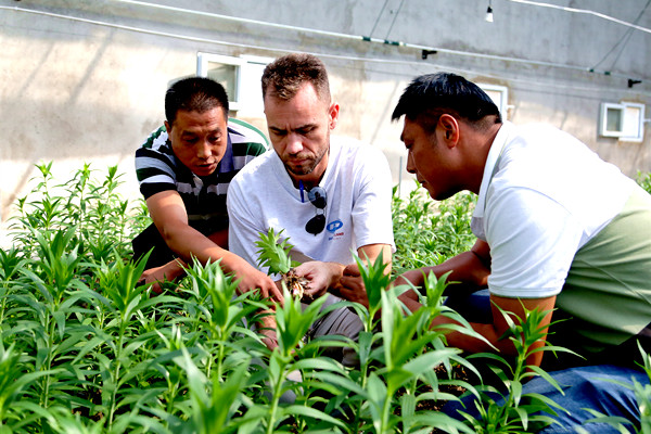 在岗埠期间,为进一步了解连云港产区今年对其公司的商业评价和市场需求,更好地服务连云港市场,对市场行情走势做出新的评估 ,aad hendriks先后考察了岗埠高效农业科技园、馨祥鲜花合作社百合花生产基地,现场调研百合鲜切花基地生产情况。Aad Hendriks重点考察了岗埠在百合花种植过程的土壤改良、耕地、整畦、种球规格、催芽技术、摆球深度、种植密度、科学施肥等各项技术操作流程,并现场指导花农按规范进行生产操作。