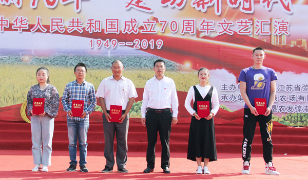 为庆祝中华人民共和国成立70周年,9月29日下午,�港农场“壮丽70年 建功新时代”文艺汇演在农干桥学校操场拉开帷幕。公司党委书记王世伯、副书记胡广斌、党委委员张德华、公司各级管理人员、驻场单位负责人、受表彰人员等与职工群众一起观看了演出。