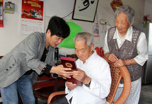 在庆祝中华人民共和国成立70周年之际,�港农场14名中华人民共和国成立前参加革命工作的、健在的老战士老同志荣获了由中共中央、国务院、中共军委联合颁发的“庆祝中华人民共和国成立70周年”纪念章。近日,公司党委书记王世伯、党委工作部负责人及社区有关人员专程为老同志们送上纪念章。