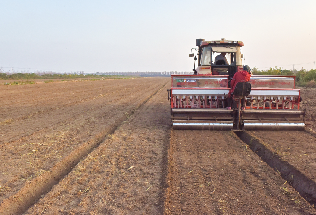 这种集多功能作业于一体,不但减少了多道农机作业对土壤的镇压破坏,保持了土壤疏松的状态,而且通过不同深度正反双轴作业,成功解决了土块过大、土壤潮湿和地面不平的难题,使播种质量大幅度地提高。经过对比,不但使农机的机械作业费降20元的基础上,还与常规机械相比要省10多斤种子。特别是在抢种抢播的情况下,使用新型机械播种,水稻茬耕翻后就能连续进行开沟平整播种作业,不但增强了小麦的抗逆栽培能力,还为抢得农时和赢得冬前积温奠定了基础。图为淮海自主研制的复式机械在开沟平整播种一体化作业时的镜头。