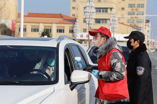 “您好!你们是从哪里过来的,请配合量一下体温。”“出行一定要戴口罩......”在交通道口,党员志愿者正在仔细地登记着来往车辆和人员信息,耐心地进行防控宣传,精心地为车上人员测量体温。