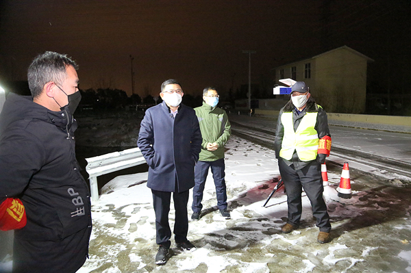 在311国道与包庄加油站交界处疫情防控点,执勤人员站在雨雪中,对入境内的车辆和人员进行详实地排查登记,精神状态和工作态度未有丝毫松懈,这也是农场入境车辆和出场车辆最多的一处防控点。“大家辛苦了,要注意个人保暖。”“希望你们克服恶劣天气来带的影响,坚守好岗位,尽心尽职,全力守护岗埠人民的健康。”来到防控点,王信学看望慰问执勤人员,并与大家亲切交谈。