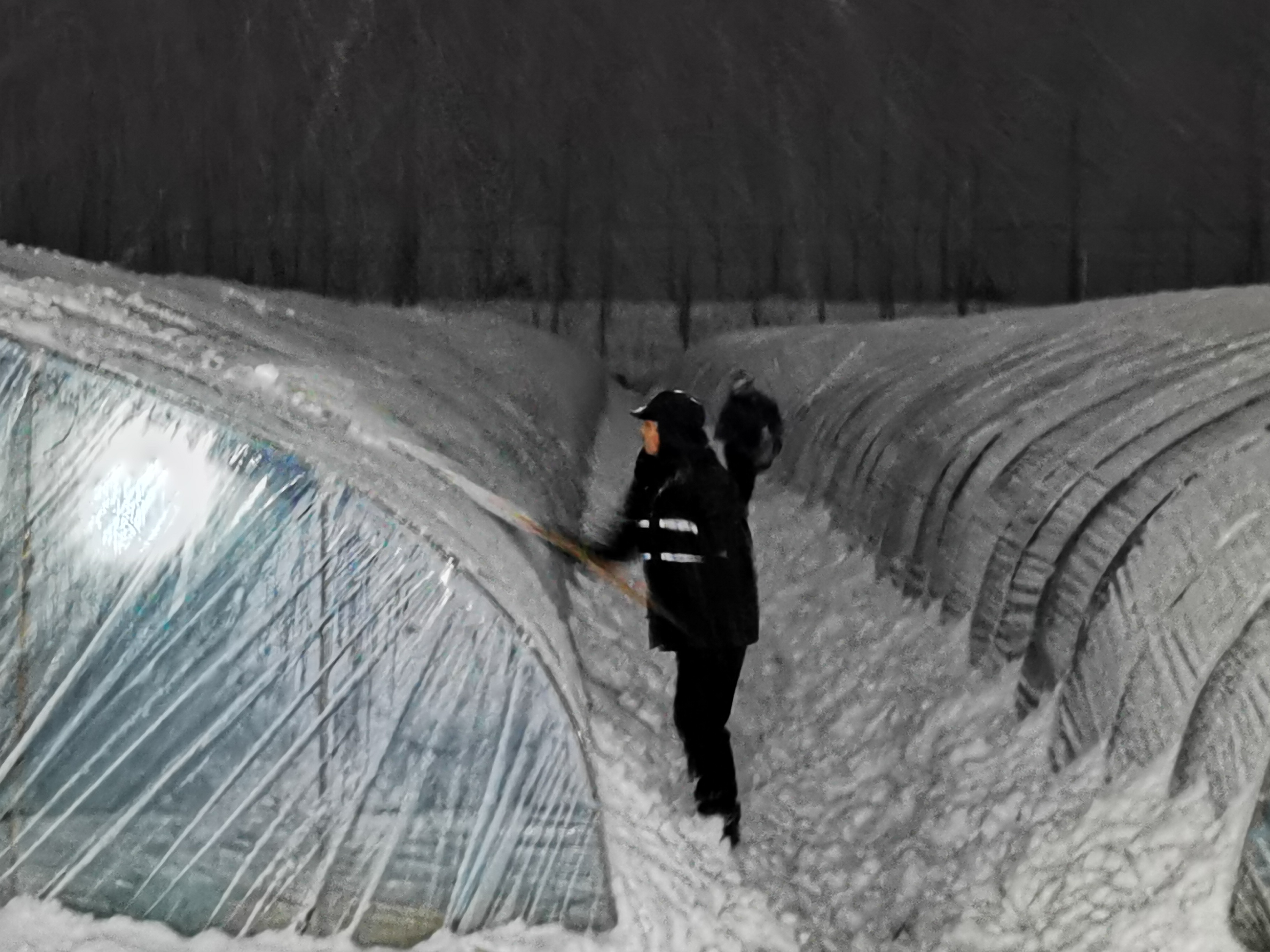 雪越下越大,刚清理的大棚上又覆盖上一层雪。他们一刻不停,1人一个大棚,4人一组,四个大棚一起,从南向北,再从北回南,用力地敲打着大棚上的积雪。