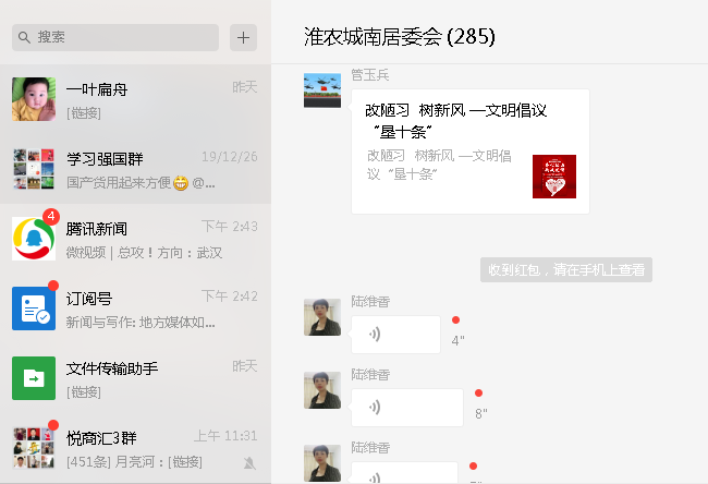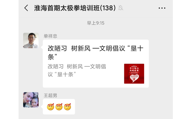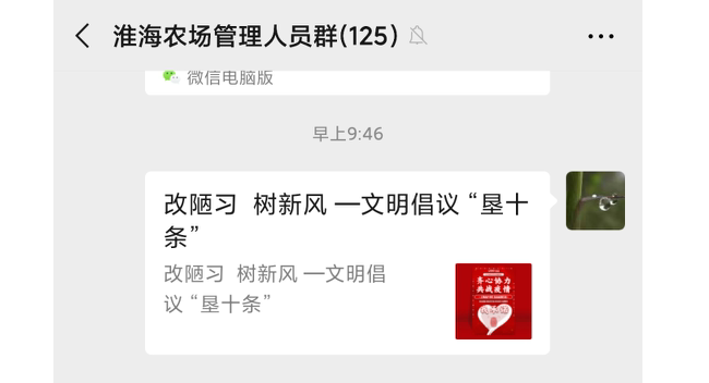 我们在淮海的多种网络平台上看到,《改陋习 树新风 文明倡议“垦十条”》首先在淮海农场有限公司的企业微信平台、淮海首期太极拳培训班微信群上,由农场公司党委书记单祥忠进行转发,随即此条我承诺倡议书迅速在淮海农场管理人员微信工作群、疫情防控群、各居委会工作群中多种平台进行转发,有的还把《改陋习 树新风 文明倡议“垦十条”》的内容制作成了百家号进行网络推介,农场公司的职工居民更是以扩散转发的形式,提升此份我承诺倡议书的影响力,从而有力地撑起了江苏农垦广大干群齐心协力,精准施策,合力构筑起了抗击疫情的有效防线的信心和决心。图为《改陋习 树新风 文明倡议“垦十条”》内容在网络上的转发截图。