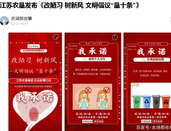 自江苏农垦集团制作的《改陋习 树新风 文明倡议“垦十条”》我承诺抗击新型冠军状病毒肺炎倡议书自发布以来,淮海农场有限公司在多种网络平台上进行转发,并以此来作为抗击疫情,以我们在行动,同舟共济,共渡难关的硬核措施,其简洁化的内容,生动的画面,便于传播的动态展示,受到了农场公司职工居民的纷纷点赞。
