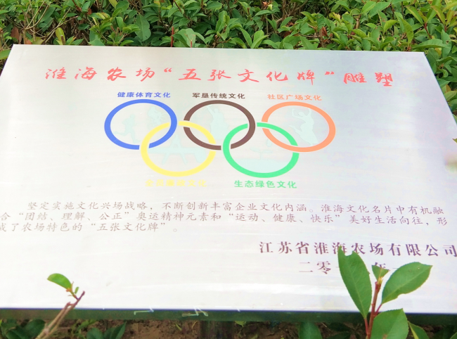 文明与抗疫同行,环境与发展同步。日前,在淮海越来越多的职工居民,在抗击疫情的战斗中,更加懂得了革陋习、树新风,常打扫、重清洁不仅是防控疫情的规定动作,更是文明健康生活的自主选择。农场社区在本次春节期间的疫情防控战役中,职工居民间倡导的文明出行行为和开展的爱国主义运动,为打赢此次疫情防控阻击战提供了坚实的“文明”保障。图为淮海文化广场上的奥林匹克雕塑与农场公司推出的精神文明创建“五张文化牌”高度融合的镜头。