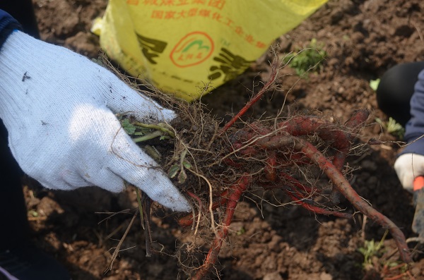 时下,正值丹参进入成熟期,复兴圩农场有限公司试验种植的26亩中草药丹参也进入了采挖期,3月8日,农场公司及社区部分干部职工放弃周末休息日,纷纷来到中草药基地参加志愿服务采挖丹参,一簇簇朱红色的丹参从地里翻出来,每棵分枝又多又粗壮,产量可观。