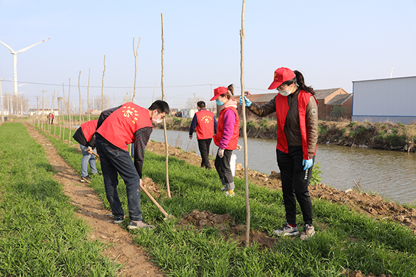 活动现场,身穿红马甲的党员志愿者和青年志愿者分布在几公里长的巨紫荆林苗种植基地,组成了一道靓丽的红色长廊。参加植树的志愿者们都按要求戴好口罩,做好防护工作,在熟悉了栽植要点后,按照分区域分组的方式,立即投入到紧张的植树劳动中。大家相互协作,分工明确,有的撒药、有的扶树苗、有的浇水、有的培土踩实,干劲十足、有条不紊。经过两个多小时的辛勤劳动,共栽植了1500余株巨紫荆树苗。看到一排排树苗迎风挺立,绽放出勃勃生机,志愿者们忘却了疲劳,露出了欣慰的笑容。