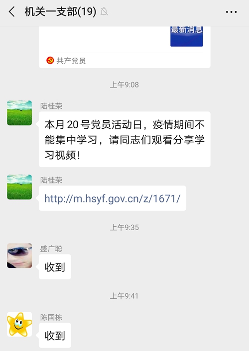 活动过程中,各支部还以留言承诺、微党课、短视频、疫情宣传、防控知识培训、防控举措分享等多种方式进行了交流。大家纷纷表示,活动很有意义,特殊时期、特殊形式的主题党日活动让自己很受教育,作为党员干部,一定会做到听从号令、冲锋在前,在疫情防控斗争中积极践行初心使命、体现责任担当,让党旗在防控疫情斗争第一线高高飘扬!