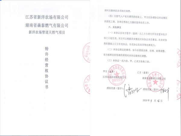 3月16日下午,湖南省森泰燃气有限公司董事长陈文华一行来到新洋,与新洋农场有限公司总经理潘元海就农场管道天然气项目特许经营权正式签订合作协议。