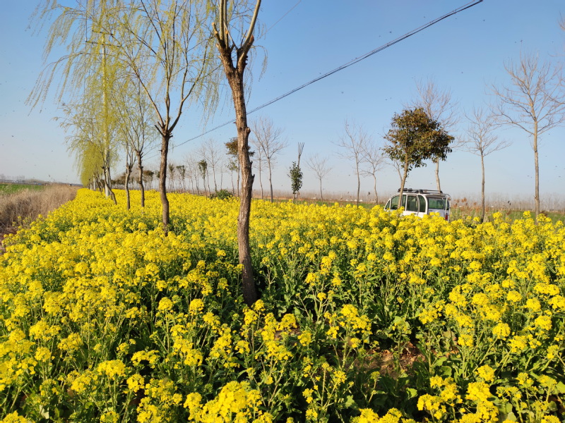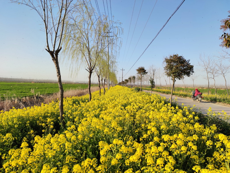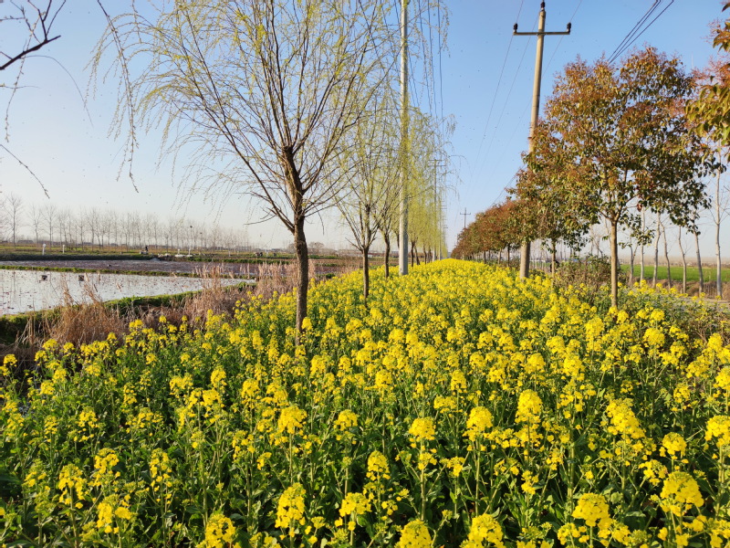 在开往淮海农场五分场社区在水泥路上,路边常绿树下套种的油菜花开一片,生长在河边的垂柳也生长出了细细的花絮,一幅春色荡漾的景象。