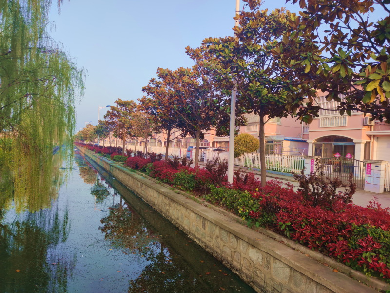 全长一公里的神禾路南侧是一条石头驳岸的河流,路的北侧是一字排开的70多套别墅,如何让别墅前道路旁的河流对行人的更安全,农场的城建建设者们首先想到的是石楠,将红叶和绿叶石楠进行墙裙的造型组合,并在其上方的空间再打造出了红叶李和广玉兰树木,不同的色彩、递次的组合空间,让神禾路成为了农场区域一道美丽的风景,让别墅“临河却不见河”,宝贵的河道岸线资源没有得到很好的发挥和利用。