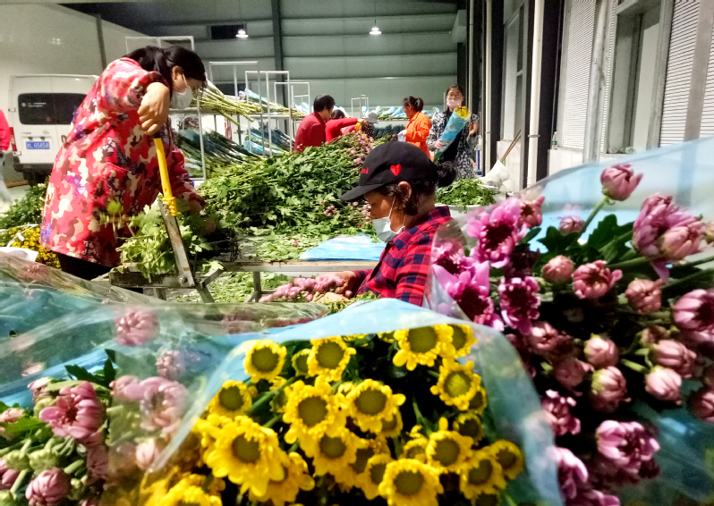 连日来,岗埠农场有限公司富民农业科技园热闹非凡。工人们裁切、包装、转运鲜切花,经纪人收购鲜切花,忙得不亦乐乎。今年园区种植的近60万株多头彩菊已进入裁切销售“小高峰”,来自周边及山东等地客商纷至沓来,争先恐后坐地收购。