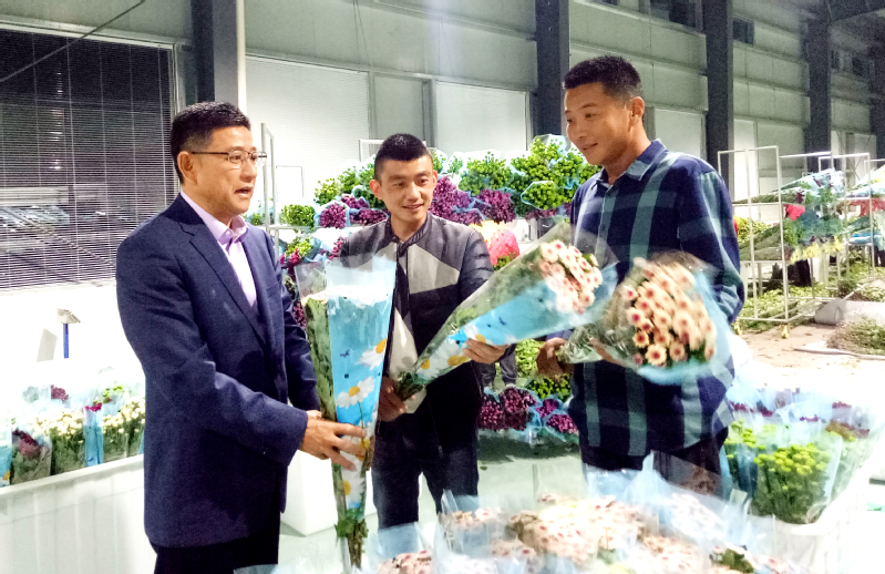 岗埠农场种植鲜切花已有20多年历史,产品销售遍布全国40多个大中城市。近年来,为了进一步推动岗埠鲜切花产业发展壮大,促进花农增收,农场公司领导审时度势,于2019年投入1600万元,建成集试验、示范、生产、加工、冷藏、销售为一体的富民农业科技园。经过近一年的实践探索,现已逐步走向正轨。2020年初,园区大胆引进新品种多头彩菊20多个品种。经过三个多月的科学管理,目前长势喜人。山东鲜花销售批发商范文峰、日照皇家鲜花&资材老板史国良闻讯赶来。当他们看到彩菊时,不禁连连称赞:“这是我们目前看到品质最好的彩菊品种了!就是数量太少了!”两位客商表示,愿与科技园长期合作,共谋发展。
