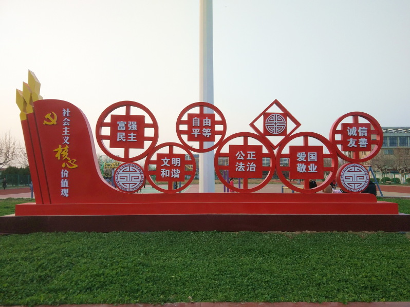 “保护生态环境、杜绝铺张浪费”。悬挂在淮海职工休闲体育运动广场栅栏上的红幅标语是那样的鲜艳,这既是农场人的执守,也是对公众的提醒,并在无形中告知路过的职工居民,要养成良好的生活卫生习惯。透过标语望去,淮海职工休闲体育运动广场健身器材中间的红色社会主义核心价值观的雕塑非常醒目,“富强 民主 文明 和谐 自由 平等 公正 法制 爱国 敬业 诚信 友善”24个大字,不仅彰显着淮海的文明程度,更透露出了淮海人由内而外焕发出来的精气神。