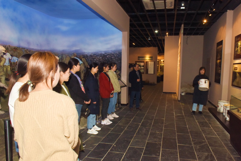 在农建四师陈列馆中,望着一件件军垦老物件,陈列馆讲解员为青年员工讲述了军垦战士当年开荒造田的历史和物件征集过程中发生的感人军垦故事,并希望青年员工要继续发扬老军垦艰苦朴素、无私奉献的军垦精神,将淮海的明天建设得更加美丽富饶。图为青年员工在听取讲解员对军垦老物件的解说。