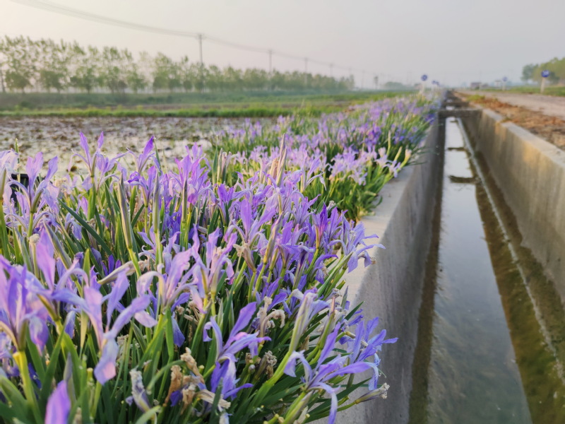 据悉,马蔺在栽培学上属于多年生旱生或湿生植物。叶片细长,坚挺柔韧。花兰紫色,花期4月下旬到5月底。由于基采用分株法繁殖。可较好地用于园林绿化工程,也可在岸边栽植。是春夏间公园和景观地带靓丽的一道风景。为此,爱莲苑水生花卉有限责任公司总经理李静通过在路边栽植马蔺植物,通过客人来苑区观光或是拍摄照片上传网络的形式,来做产品样品广告,从而赢得了市场的厚爱。图为生长着路边渠旁的马蔺水岸植物的风姿。