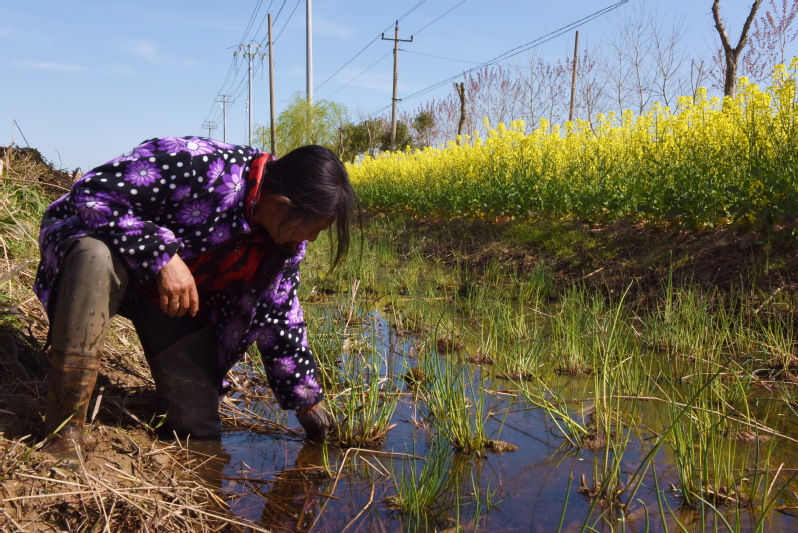 为了弥补水葱栽种面积的不足,爱莲苑还通过挖掘农场周边沟河渠中水葱分布广的资源优势,借助苑区出台的特殊野生植物资源的收购政策,从而让淮海生产的水葱走向全国水生花卉植物市场,甚至出口到国外,也为苑区增加了一笔额外的资源收入。图为爱莲苑区生长的花叶、绿叶水葱和苑区员工在沟河中繁殖野生水葱时的镜头。