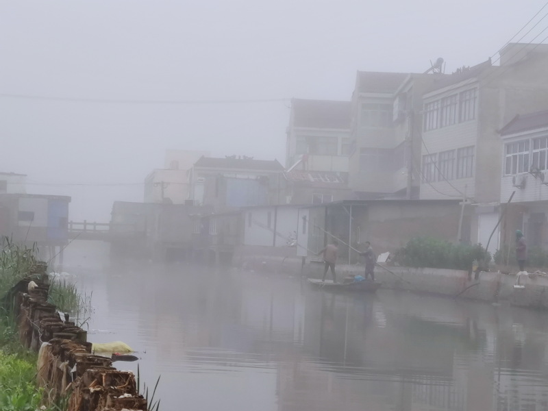 淮海农场有限公司因为与农村插花而居的现象,许多河道流经农场和农村,为了对这些河道的有序管理,农场和农村通过责任界定,对各个流经分管区域的河道加强水资源保护,全面落实最严格水资源管理制度,严守“三条红线”。同时还加强河道水域岸线管理保护,加强水污染防治,统筹水上、岸上污染治理,排查入河污染源,优化入河排污口布局。通过加大黑臭水体治理力度,确保流经农场农村的河道实现环境整洁优美、水清岸绿。图为位于农场一侧的六垛居委会的管护者,在浓雾中用船在清理风雨后飘落在河面上的垃圾。