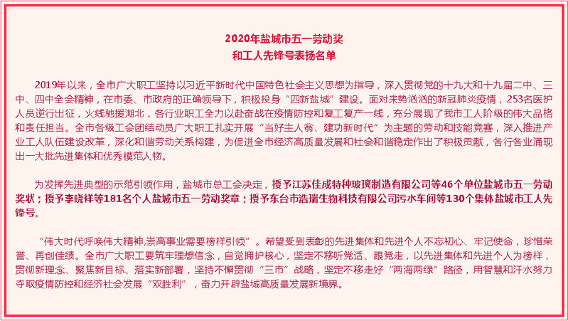 在“五一”国际劳动节长假过后的5月6日上午,淮海农场有限公司工会负责人特地来到盐城市总工会,领回了一张由金质纸面构成的“盐城市五一劳动奖状”奖牌,淮海农场有限公司获2020年“盐城市五一劳动奖状”这一殊荣,这是盐城市总工会授予全市企事业单位的最高荣誉,旨在表彰为盐城市经济建设和社会发展做出突出贡献的先进集体,是对农场公司在推进盐城市“四新盐城”建设,扎实开展“当好主人翁,建功新时代”为主题的劳动竞赛,坚持不懈贯彻“三市”战略,坚定不移走好“两海两绿”路径、推动盐城走在高质量发展前列建功立业,发挥先锋队和主力军作用的充分肯定和高度嘉奖。