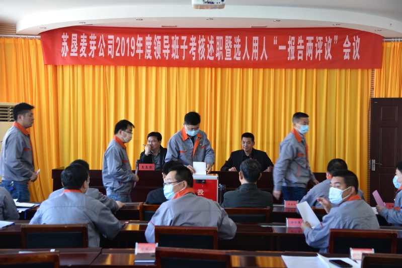 根据集团党委《关于做好2019年度企业领导班子和领导人员年度考核及选人用人“一报告两评议”工作的通知》要求,5月7日上午,苏垦麦芽公司召开2019年度领导班子考核述职暨选人用人“一报告两评议”会议。集团公司考核组王玉强等出席会议,公司经营层班子、中层助理以上管理人员参加了会议,会议由公司党委书记、董事长、总经理郭世平主持。