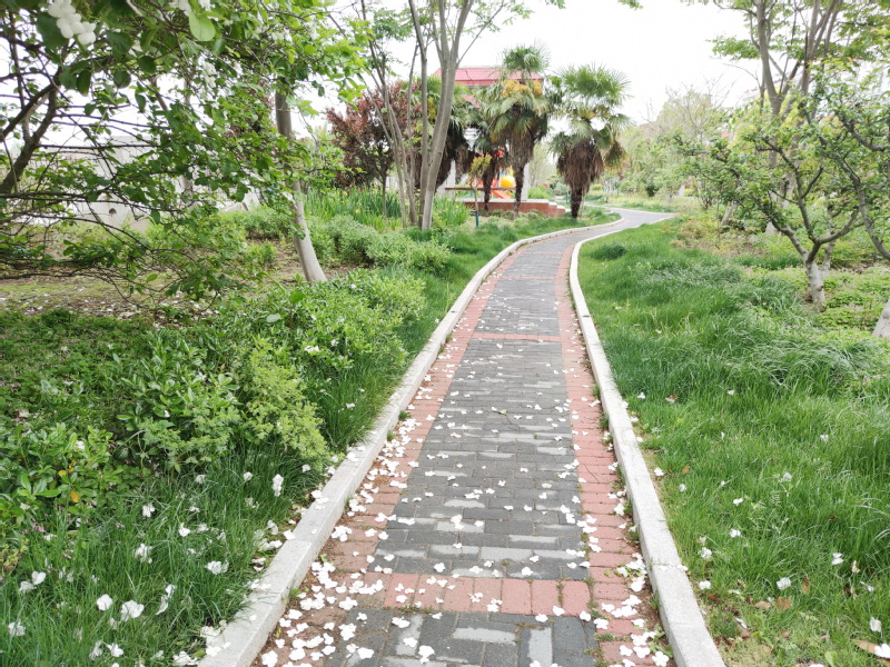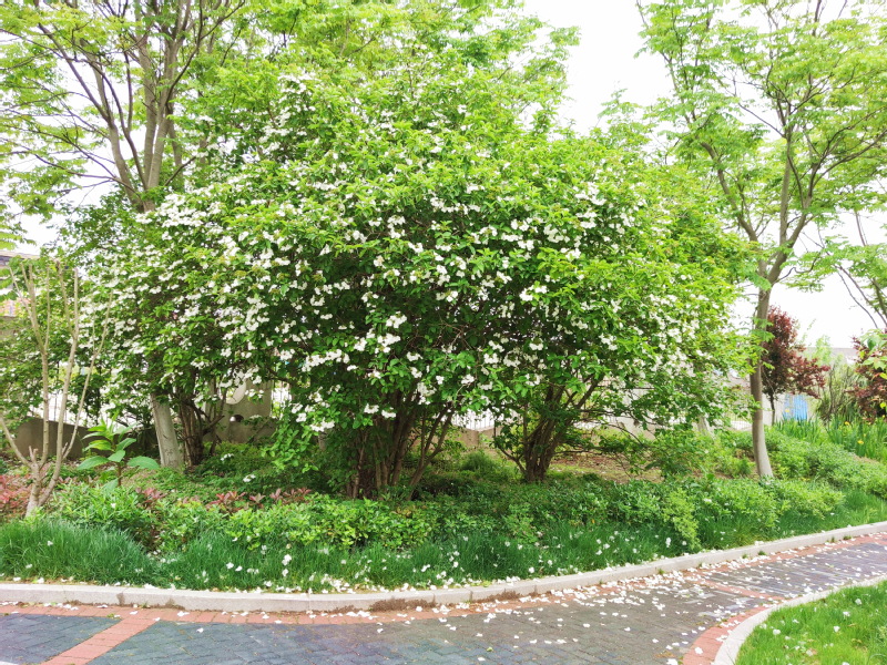 据悉,这株荚蒾经过多年的栽培养护,在这里已经生长了近30年,每年开放的白色花朵,远远看去,树上花蕾盈枝,又像是“雪球”满树冠,亦如美玉之璀璨,非常壮观;若走近细瞧,这些铺满树冠的白色花朵,在暖阳下随风摇曳,风姿绰约,让人看了美不胜收。只是当我今天知晓它的名字时,这株荚蒾花已悄然花谢,掉落的花朵铺满了林间的小道,似落叶缤纷,但残落在枝头的花朵依旧似瑞雪之晶莹。