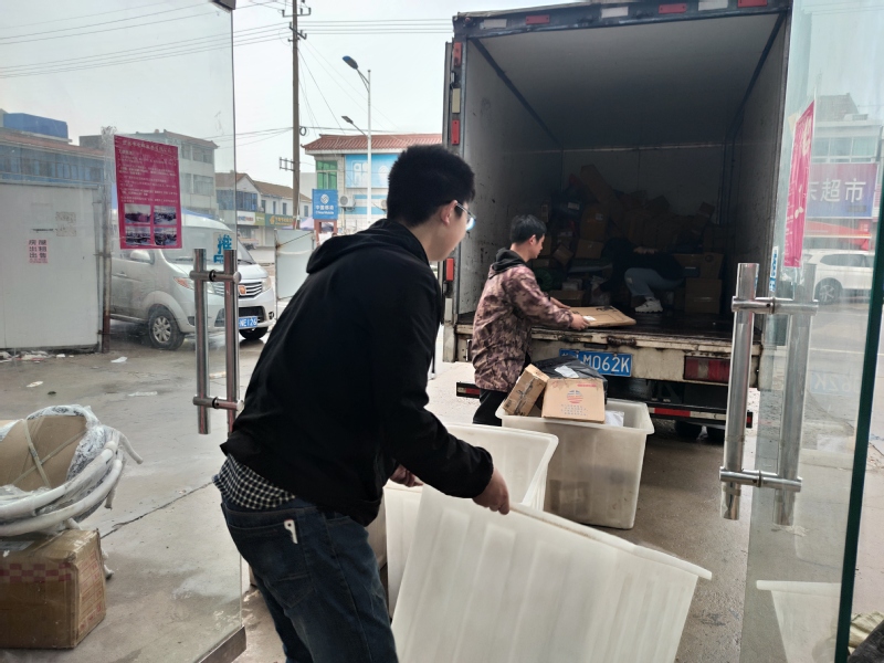 5月8日傍晚,一车厢式货车停靠在农场全球快递的门前,只见五六名快递员麻利地拿着五六个大口的塑料桶,把送货员传送下来的物品装到桶内,再拉到分检店内扫码编号,整个过程忙而有序。